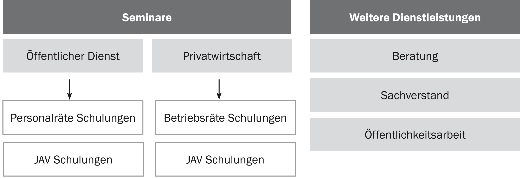 Unser Leistungsspektrum umfasst nicht nur ein umfangreiches Seminarangebot, sondern auch weiterführende Dienstleistungen, wie Beratung, Sachverstand und Öffentlichkeitsarbeit. Wir möchten unsere Kunden in allen Belangen zur Seite stehen und bieten deshalb einen umfassenden Service aus einer Hand.